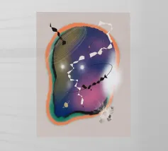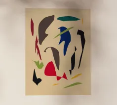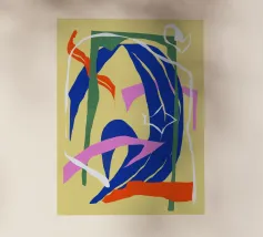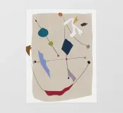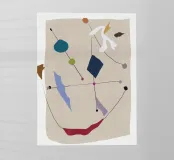 Forme astratte in colori tenui sono collegate tra loro da sottili linee nere, creando una composizione dinamica. Il disegno incorpora varie forme geometriche e organiche, aggiungendo un senso di equilibrio e movimento.