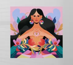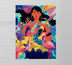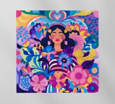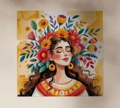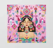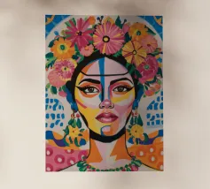 Il dipinto presenta una persona circondata da motivi intricati e colorati, creando una composizione dinamica e vivace.
