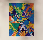 Una composizione astratta che fonde elementi floreali stilizzati con audaci forme geometriche in una vibrante tavolozza di blu, gialli, arancioni e verdi, creando una dichiarazione artistica dinamica e moderna.