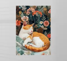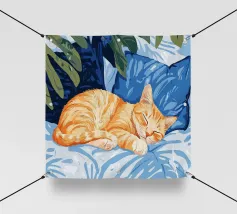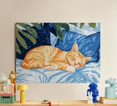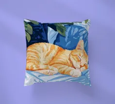 gatto gatto arancione gatto che dorme letto cuscini piante fogliame pianta da interno foglie tropicali foglie di monstera cuscini relax arredamento per la casa animale domestico riposo consistenza morbida animale domestico calma tempo libero foglie verdi