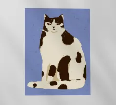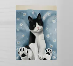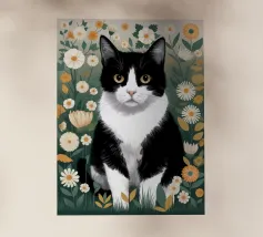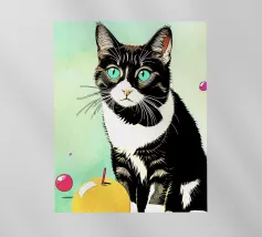 Un bel gatto tuxedo bianco e nero siede in una posizione composta ed elegante, guardando direttamente l'osservatore con un'espressione calma e gentile, catturata in un ritratto semplice e bello.