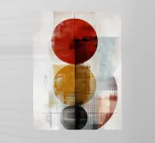 Un'audace opera d'arte astratta con tre grandi cerchi impilati verticalmente in rosso intenso, giallo oro e nero. Gli strati strutturati e i sottili dettagli lineari creano profondità e movimento, mentre lo sfondo neutro aggiunge equilibrio. Questa sorprendente composizione fonde un design moderno con un tocco retrò, rendendola un pezzo accattivante per interni contemporanei, industriali o eclettici.