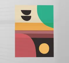 A geometric composition features a stylized orange fish against a backdrop of colored rectangles and circles, blending teal, black, and green shades. Bold shapes and contrasting colors create a modern, abstract aesthetic.