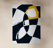Audaci motivi geometrici si intrecciano con un sorprendente accento giallo in un design che enfatizza il contrasto. Le forme curve e angolari in bianco e nero creano un flusso visivo dinamico.