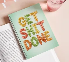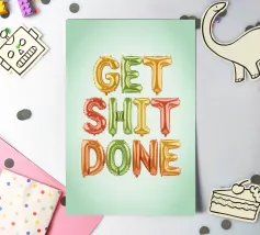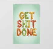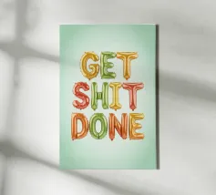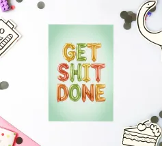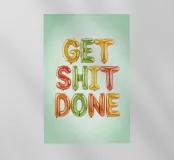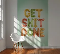 Poster tipografico motivazionale con lo slogan "Get Shit Done". Le lettere colorate nei vivaci colori dell'arcobaleno su uno sfondo verde chiaro irradiano energia e gioia di vivere: un moderno eye-catcher con un messaggio positivo.