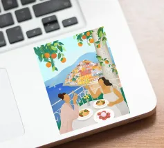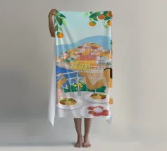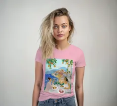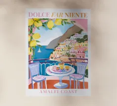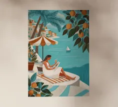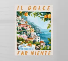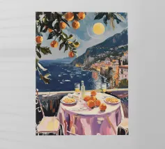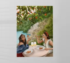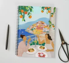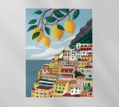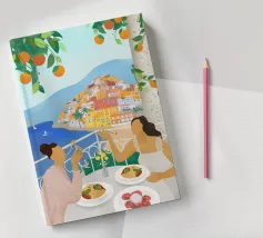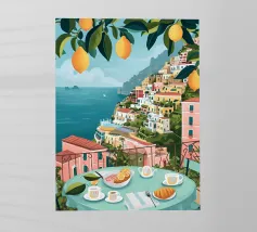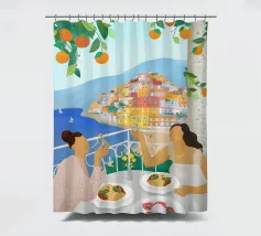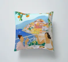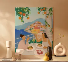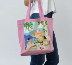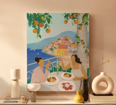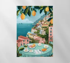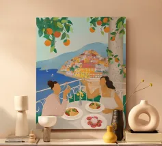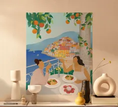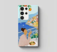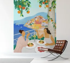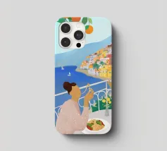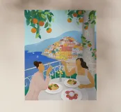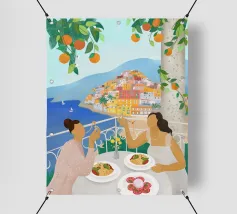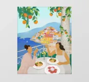 Illustrazione di donna che mangia shpagetti a Positano, Italia.