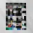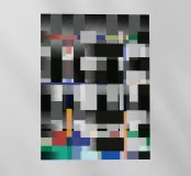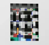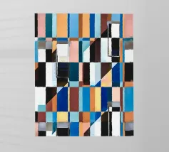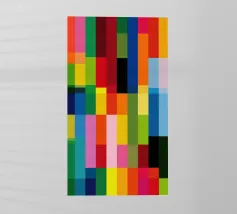 Una disposizione geometrica di rettangoli e quadrati colorati crea un vivace motivo astratto. Il disegno utilizza uno sfondo in scala di grigi con tonalità arancioni, blu e verdi, creando una composizione visivamente dinamica.