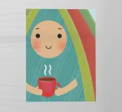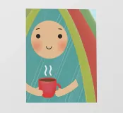 Un'illustrazione rasserenante che raffigura una persona dal sorriso gentile con in mano una tazza di caffè caldo.