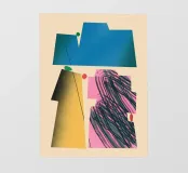 Bold geometric shapes in blue, yellow, and pink contrast against a neutral background. Organic shadows and colorful dots provide a dynamic and abstract composition.
