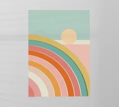 Questa delicata illustrazione mostra un arcobaleno in colori pastello con morbide sfumature di colore dall'azzurro al rosa, al giallo pastello e al verde chiaro. Le linee geometriche e le strisce strutturate danno un tocco moderno all'opera grafica e riflettono la natura. Un gioco armonioso di colori che irradia calma e gioia.