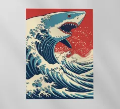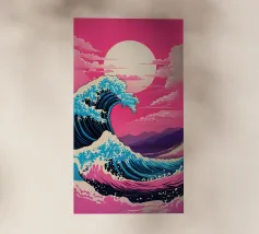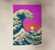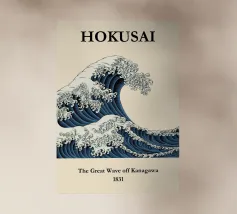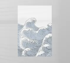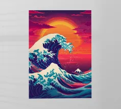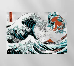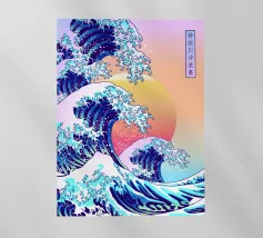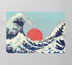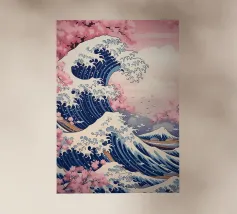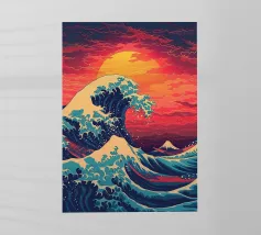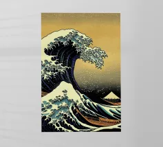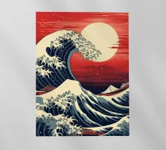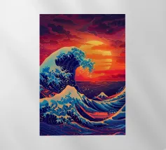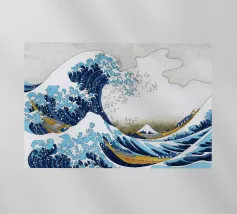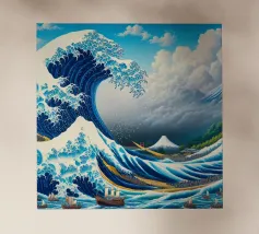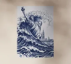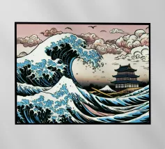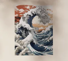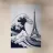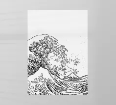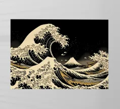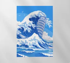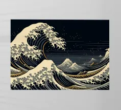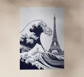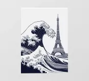 L'immagine raffigura un'illustrazione stilizzata in bianco e nero della Grande Onda al largo di Kanagawa, una famosa xilografia giapponese, con la Torre Eiffel sovrapposta all'onda. L'onda è raffigurata in un movimento dinamico e vorticoso, con creste spumeggianti e una base blu intenso. La Torre Eiffel si erge alta e slanciata, con la sua struttura intricata che contrasta con la forma organica dell'onda.