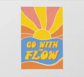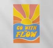 Un motivo solare in stile anni '70: un sole giallo splende in alto con raggi caldi in rosa, arancione e giallo, mentre sotto scorrono onde blu, con la scritta "GO WITH THE FLOW" in un vibrante giallo vintage. Le linee curve e la ricca palette di colori trasmettono leggerezza e una sensazione di spensieratezza estiva. Ottimismo, libertà e relax: un mantra visivo che invita a godersi il momento e ad abbandonarsi al ritmo naturale.