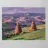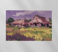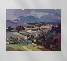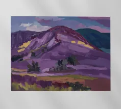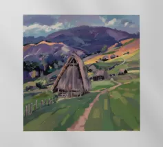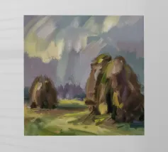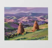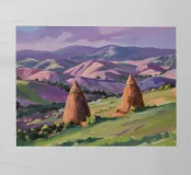 A serene landscape centered on a well-formed haystack standing in a field characterized by gently rolling hills in muted shades of purple and green, all under a soft, calm sky.