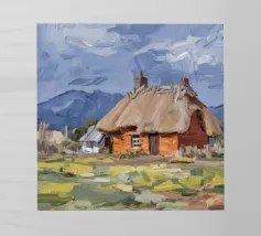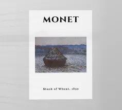Un dipinto di paesaggio con un grande pagliaio in un campo vicino a un fiume o a uno specchio d'acqua tranquillo. Il cielo è di un grigio tenue e coperto, e la tavolozza generale è sobria con toni terrosi.