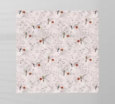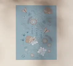Le farfalle si godono la giornata di sole, volando e bevendo nettare, circondate da un disegno ondulato di foglie, fiori profumati e piccoli insetti.