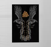 Un potente simbolo della mitologia norrena: due corvi dettagliati con le ali spiegate incorniciano il Valknut - antico simbolo di Odino - mentre misteriose rune scorrono sulle piume. La raffigurazione ad alto contrasto in nero e oro trasmette forza, saggezza e profondità spirituale. Ideale per gli appassionati di leggende nordiche, estetica vichinga o simbolismo spirituale. Questo motivo è particolarmente adatto a studi, spazi di lavoro o come parte di una collezione mistica.