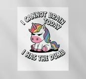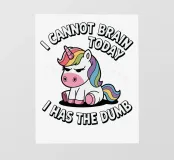 Un simpatico unicorno con una criniera arcobaleno siede circondato da stelle, accompagnato dal testo umoristico "Oggi non posso fare il cervello, ho il muto". L'immagine è collocata su uno sfondo semplice.