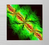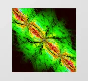 Caratteri vorticosi in tonalità vivaci di verde, rosso e giallo allineati in diagonale su uno sfondo nero ...