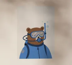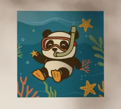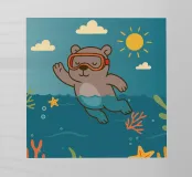 Simpatico orso con occhiali da sub che nuota nel mare. Scena subacquea giocosa con coralli e stelle marine. Perfetto per disegni per bambini, prodotti estivi e illustrazioni marittime.Orso allegro con maschera da snorkeling Mondo sottomarino colorato con sole Design infantile e giocoso Ideale per motivi estivi, marini e animali Perfetto per poster, abbigliamento...
