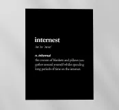 Embrace your digital comfort zone with our witty "Internet" typography art print. This clever design presents a humorous dictionary-style definition in crisp white serif text on a sleek black background, perfectly capturing the cozy reality of modern online life. Ideal for tech enthusiasts, homebodies, and anyone who appreciates a good Netflix binge, it adds a touch of relatable humor to any space. The stark contrast and formal typography style create a visually striking piece that's both amusing and stylish. Available on various products, this versatile design makes a perfect gift for the int