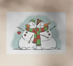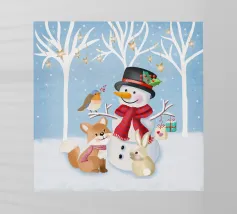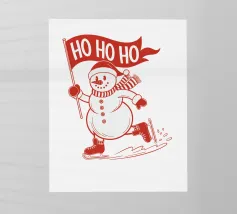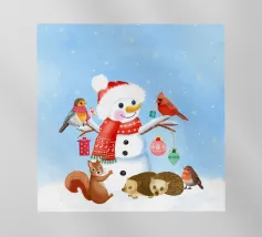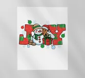 Un allegro pupazzo di neve e un omino di pan di zenzero si trovano accanto a una grande scritta rossa "JOY" ornata da fiocchi di neve e circondata da decorazioni natalizie. Scatole regalo e ornamenti festosi completano il tema stagionale.