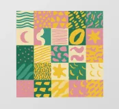 A cheerful and colorful pattern composed of a grid of squares, each filled with different playful, geometric, and organic designs. The artwork has the warm, joyful feel of a modern, handcrafted quilt.