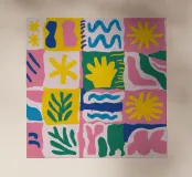 Una griglia gioiosa e colorata è riempita da una varietà di motivi e icone giocose, tra cui fiori stilizzati e forme astratte, che creano un design allegro e decorativo.
