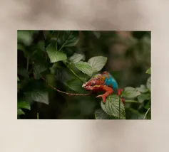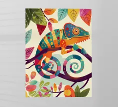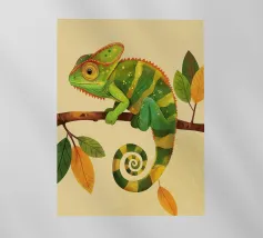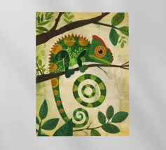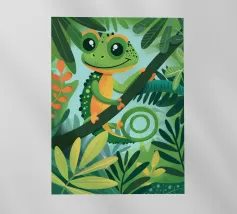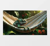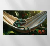 Questo camaleonte si è adattato magistralmente alla modalità relax. Con le zampe allentate sul bordo dell'amaca e uno sguardo di pura soddisfazione, è la prova vivente che a volte il pisolino è uno stile di vita. Questa stampa fa parte della serie "Jungle Hammock Tales" - relax estivo con una strizzatina d'occhio. Questa illustrazione digitale è stata creata in stile fotorealistico, con un occhio di riguardo per la luce, i dettagli e l'atmosfera. Visualizzata da Trinkets NL Design Studio utilizzando l'AI.