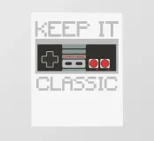 A retro gaming controller is depicted with the phrase "KEEP IT CLASSIC" in pixelated text. The design evokes nostalgia through its vintage aesthetic and simple color palette.