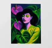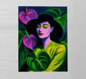 Una poesia visiva di colori e forme: Questa composizione emotivamente provocatoria combina la colorazione fauvista con una tranquillità surreale. La pelle viola della figura, incorniciata da un fogliame tropicale e da luminosi anthurium, evoca le opere del tardo espressionismo e la profondità emotiva dei ritratti di Frida Kahlo. Gli occhi chiusi e il ricco blu dello sfondo creano un'atmosfera meditativa. Un'opera che unisce natura, femminilità, erotismo e colore in un'armonia ipnotica. Una fusione perfetta tra pittura decorativa ed estetica contemporanea: una festa per gli occhi e per l'anima.