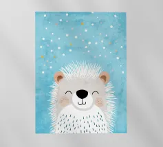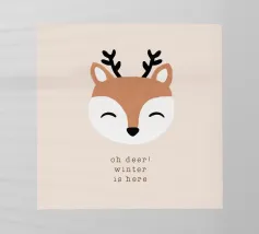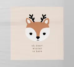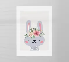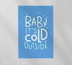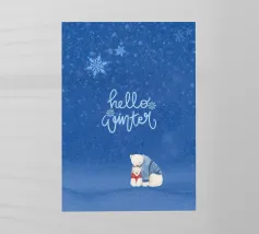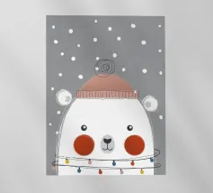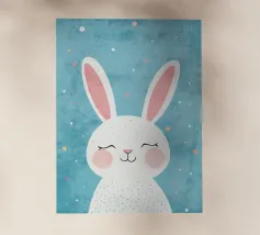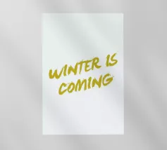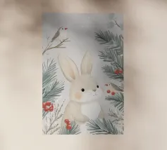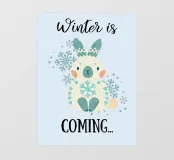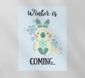 Un adorabile coniglietto invernale con morbide orecchie circondato da fiocchi di neve che fluttuano dolcemente. Il coniglietto è pronto per la stagione fredda. Sopra di lui, la scritta "Winter is Coming" in un carattere elegante e giocoso completa il disegno.