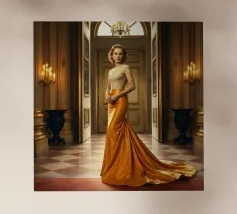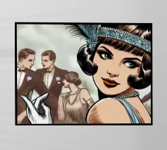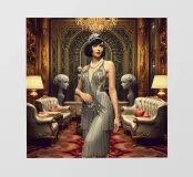 Elegante flapper con un lussuoso abito di perline, perle e abiti Art Deco... Questa immagine mostra un'affascinante flapper girl circondata da opulenti accenti metallici, arredi sontuosi e decorazioni ornamentali, mescolando elementi futuristici e Art Déco con curve organiche e surrealismo sognante.