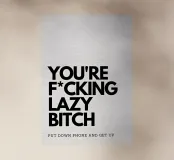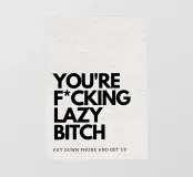 "Le parole 'YOU'RE F*CKING LAZY BITCH' sono impilate in un carattere sans-serif nero in grassetto, con l'asterisco che censura la 'U' di 'FUCKING', seguito dalla frase 'PUT DOWN PHONE AND GET UP' in un carattere serif più piccolo e delicato, il tutto su uno sfondo bianco sporco",