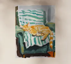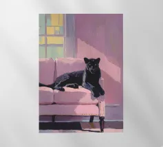 Un'opera d'arte serena e stravagante di un ghepardo che sonnecchia pacificamente su un divano vintage a righe bianche e verdi. I motivi vivaci e la postura accogliente del grosso felino creano un contrasto sognante e spiritoso tra la natura selvaggia e la rilassata vita domestica. Perfetto per gli amanti degli animali, i collezionisti d'arte eclettica e gli appassionati di estetica d'interni giocosa.