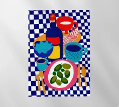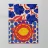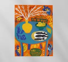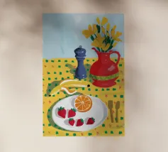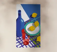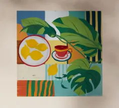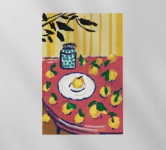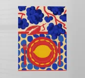 A bold, graphic pattern featuring a lemon sun motif, blue grapes or flowers, and red shapes. The style is modern and has a pop art feel.