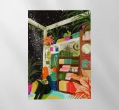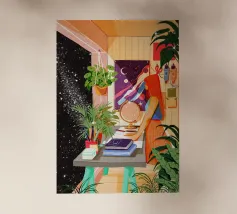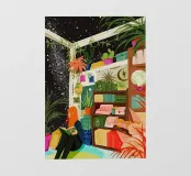 libri libreria lettura piante verde piante in vaso scaffale decorativo libri su scaffali donna che legge piante da interno amante dei libri piante appese cosmo stelle cielo notturno interno relax angolo accogliente arredamento astronomico tema celeste