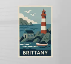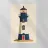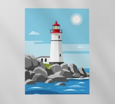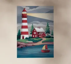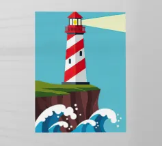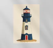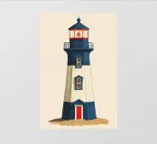 L'immagine mostra un affascinante faro in uno stile stilizzato e illustrato. La combinazione di colori è chiara e decisa: un motivo blu e bianco con un ingresso rosso e dettagli delle finestre. La parte superiore della torre è sottolineata da una galleria con ringhiere e da una finestra delineata in rosso, in cui è visibile una lampada. Il faro si erge su uno sfondo sabbioso. Lo stile ricorda un misto di grafica e illustrazione classica: linee chiare, colori piatti e una rappresentazione stilizzata, quasi giocosa.