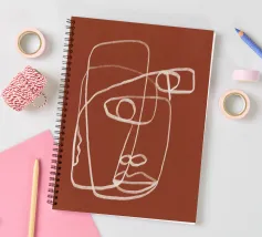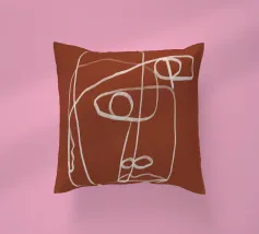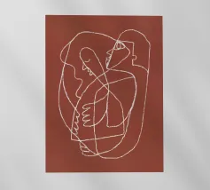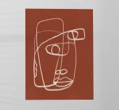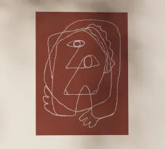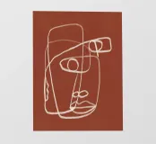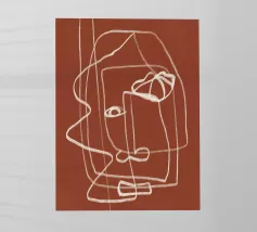 Una linea bianca continua crea un volto astratto su uno sfondo marrone rossastro. Le linee sono morbide e si sovrappongono, dando l'impressione di semplicità e complessità.