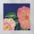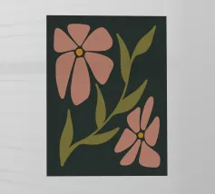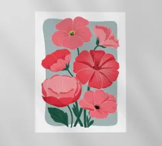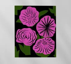 Una vista macro e ravvicinata di grandi fiori rosa, forse peonie o dalie, con accenni di bianco e giallo. Lo sfondo è di un blu marino intenso, che crea un contrasto drammatico con i fiori delicati e vibranti.