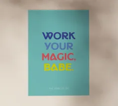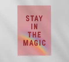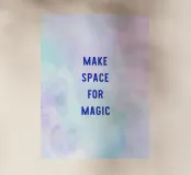 "Fai spazio alla magia" in caratteri blu su uno sfondo acquerellato pastello con una sfumatura di colore dall'azzurro al rosa. Un design onirico e creativo, pieno di leggerezza, ispirazione e delicata auto-riflessione.