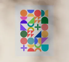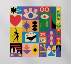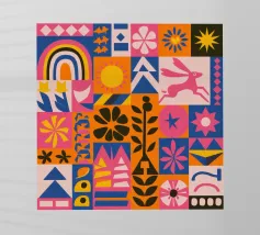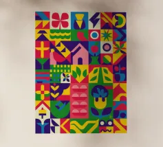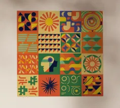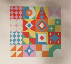 Un motivo complesso e vivace composto da una griglia di piastrelle geometriche, ognuna con un disegno e una combinazione di colori unici, che creano una matrice visiva sorprendente.