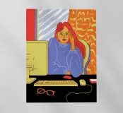 A contemporary illustration of a woman with vibrant red hair working at her computer in a dimly lit room. The glow from the screen illuminates her face and blue shirt. The scene captures a moment of focus and late night productivity, with personal items like glasses on the desk.