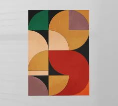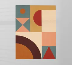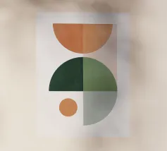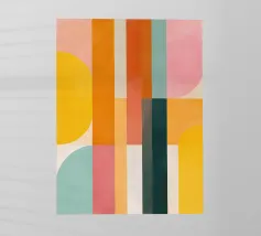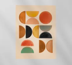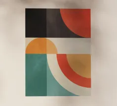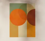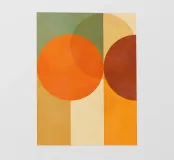 Composizione minimalista di metà secolo con forme geometriche semplici e colori accoglienti, tra cui arancione, marrone, beige e verde acqua, che evocano l'evoluzione del sole in una luminosa giornata autunnale. Con i suoi toni caldi, quest'opera d'arte retrò è in grado di ravvivare qualsiasi ambiente. Una scelta perfetta per case, uffici e hotel. Parte di un duo.