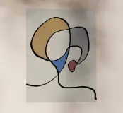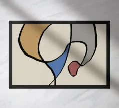 Linee e forme astratte creano una composizione minimalista dai colori tenui, con contorni neri decisi che definiscono le forme organiche. Uno sfondo chiaro esalta il contrasto tra i toni della terra e i tenui colori pastello.