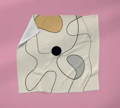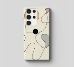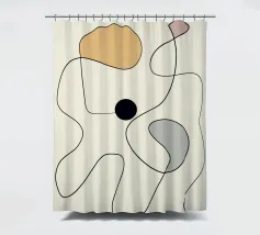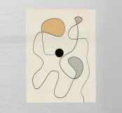 Forme e linee astratte si intrecciano in un design minimalista, caratterizzato da colori tenui come ocra, nero e grigio. Linee curve e fluide creano un senso di movimento, collegando varie forme geometriche.