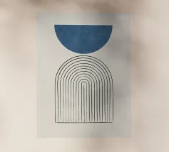 Opera d'arte digitale minimalista con linee nere come pennellate e forme astratte bianche in un cerchio. Disegno astratto in colore blu pastello e sfondo beige per interni boho, minimalisti, industriali o moderni. Se preferite la semplicità e l'eleganza, questa è un'opera d'arte digitale equilibrata.