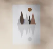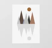 Le forme geometriche formano un paesaggio montano minimalista, con un cerchio in alto che ricorda il sole. Sotto è raffigurato un riflesso invertito delle cime, che crea un disegno simmetrico.
