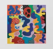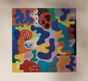 Una composizione astratta giocosa e colorata con una serie di forme organiche simili a blob di varie dimensioni e tonalità. La disposizione stravagante e la tavolozza vibrante creano un senso di gioia spontanea e libertà artistica.