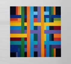Una varietà di linee spesse e sottili si incrociano e si sovrappongono su uno sfondo chiaro, creando un disegno intricato. Segmenti colorati nei toni del blu, del verde, del giallo e del viola aggiungono un vibrante contrasto alle linee nere.