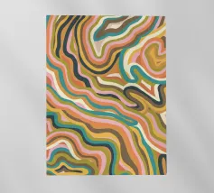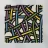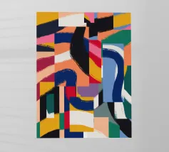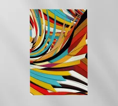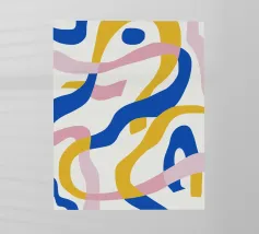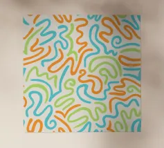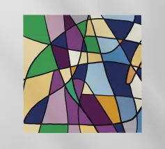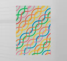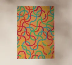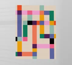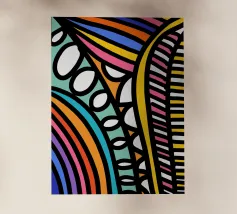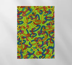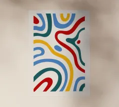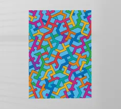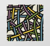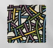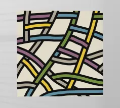 Una varietà di linee spesse e sottili si incrociano e si sovrappongono su uno sfondo chiaro, creando un disegno intricato. Segmenti colorati nei toni del blu, del verde, del giallo e del viola aggiungono un vibrante contrasto alle linee nere.